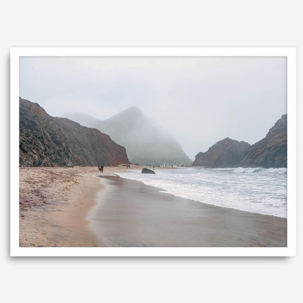 Der matte Sand reflektiert blasses Licht und schafft eine verträumte Atmosphäre, in der Erde und Meer mit stiller Anmut aufeinandertreffen. Gestalten wandern langsam entlang der Gezeitenlinie, verloren in der Stille der nebelverhangenen kalifornischen Küste.