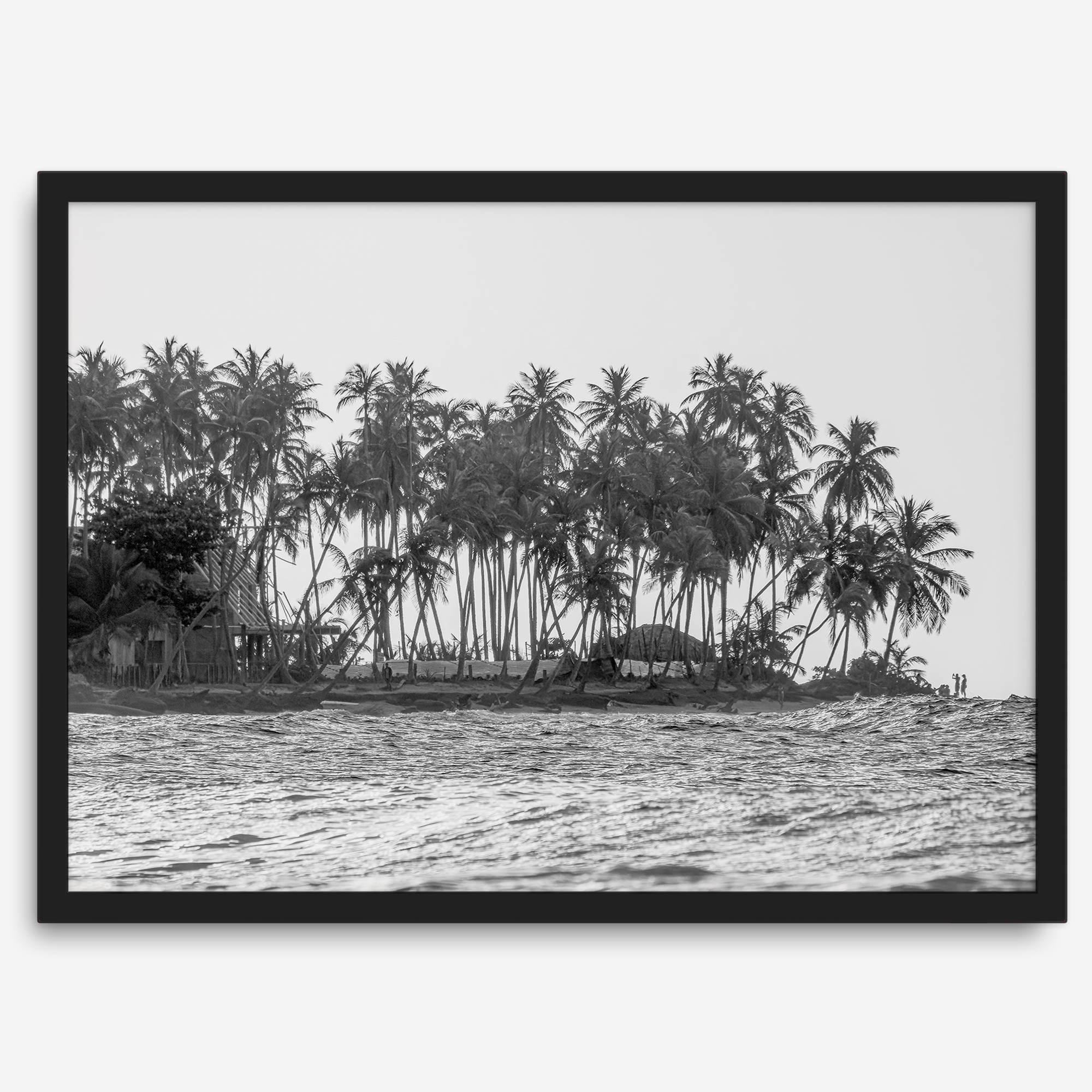 Countless Palm trees sway gently in the breeze at the edge of a lush island, The gentle waves of the ocean lap at the shore, and In the distance, the silhouettes of two figures stand at the water's edge, dwarfed by the grandeur of the landscape. The black and white palette adds a touch of sophistication to this tropical scene, transforming it into a piece of timeless fine art. This captivating print is sure to transport you to a place of relaxation and serenity and would be a perfect addition to any coastal or nature-inspired home.