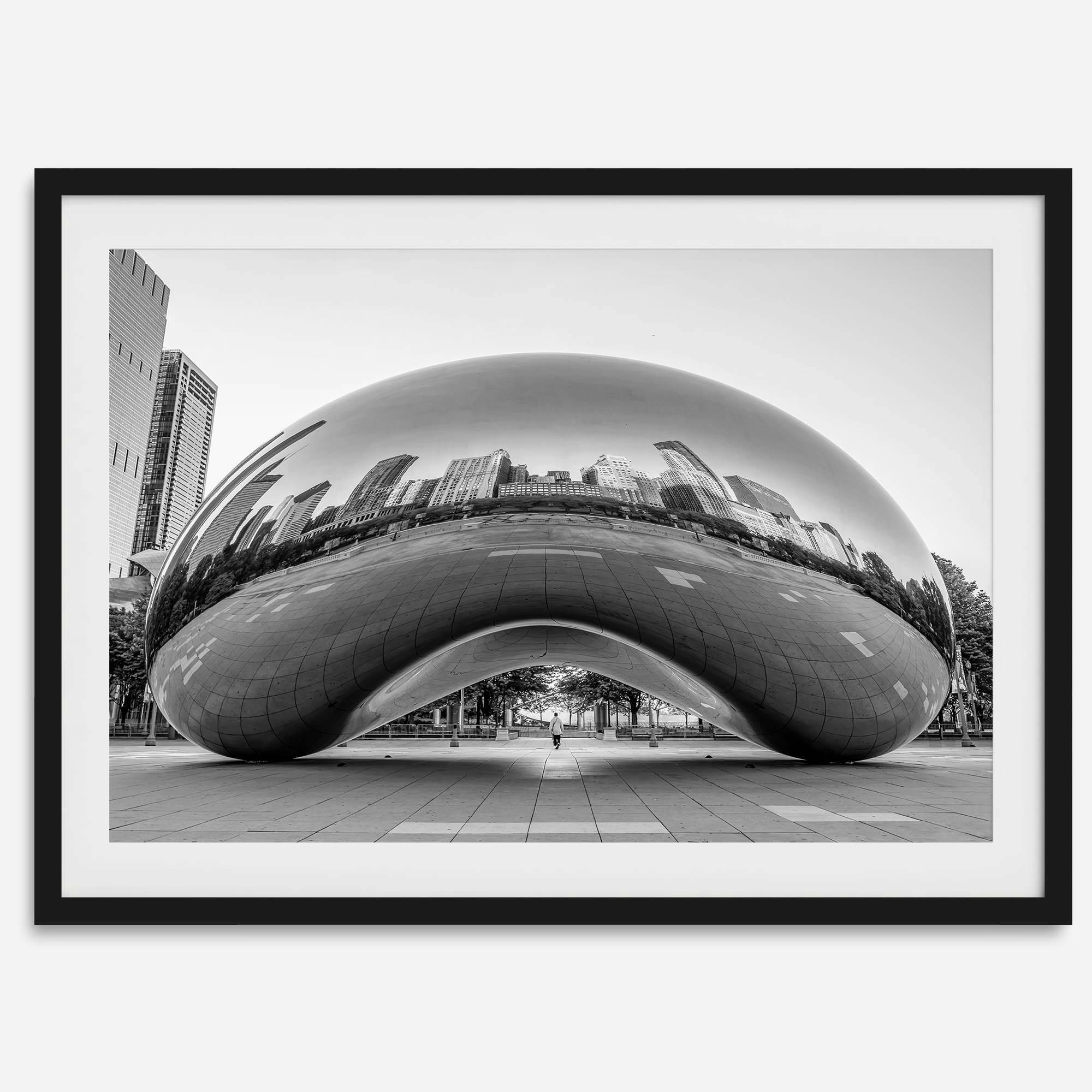 This striking Chicago wall art captures the famed Cloud Gate sculpture in stunning black and white. The highly reflective surface of the artwork, also known as “The Bean,” mirrors the towering skyline of Chicago’s downtown. This architecture photography print creates a mesmerizing blend of art, architecture, and urban life. The curved, metallic surface draws the eye toward the surrounding skyscrapers, creating a sense of motion and modernity in this iconic urban scene.